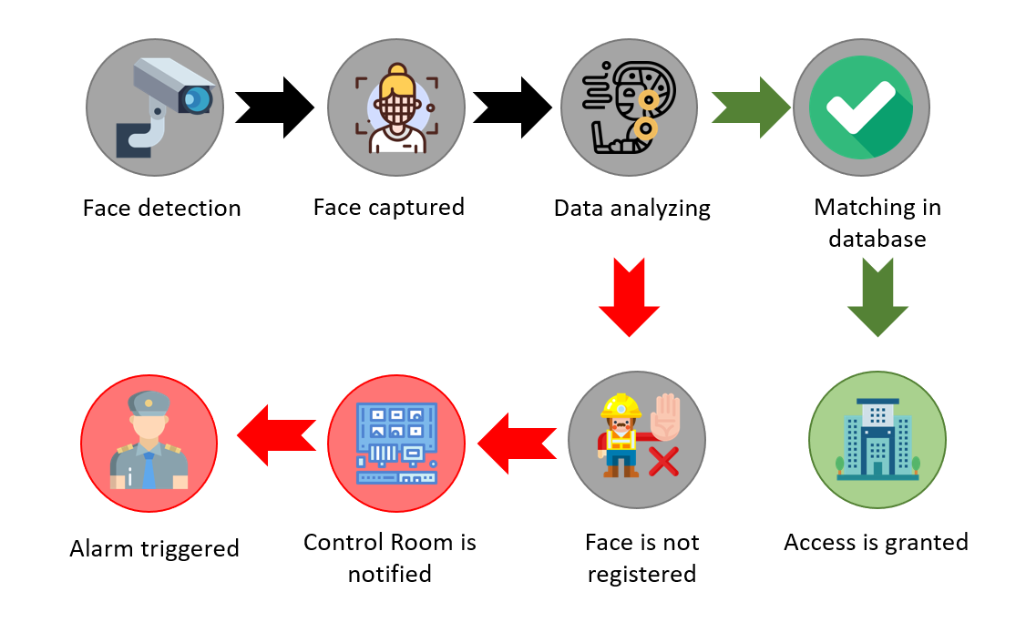 The biometric data associated with the individual face will first be stored in the database. When the visitor wished to cross any checkpoint, they are required to scan their face and check if the scan matches or not. If it is a mismatch, access will be denied.